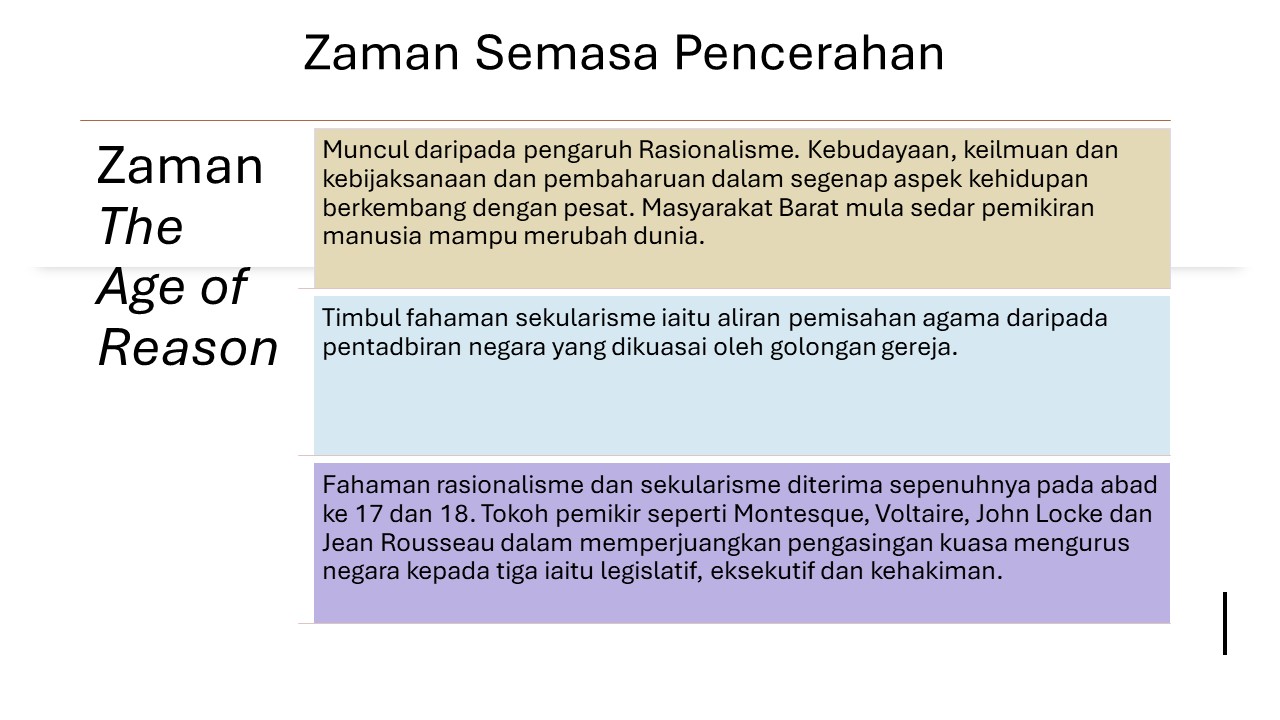 Zaman Semasa Pencerahan (Englightenment): Reformasi gereja, pemimpin agama dan gereja berkurangan, berlaku pemisahan agama daripada politik